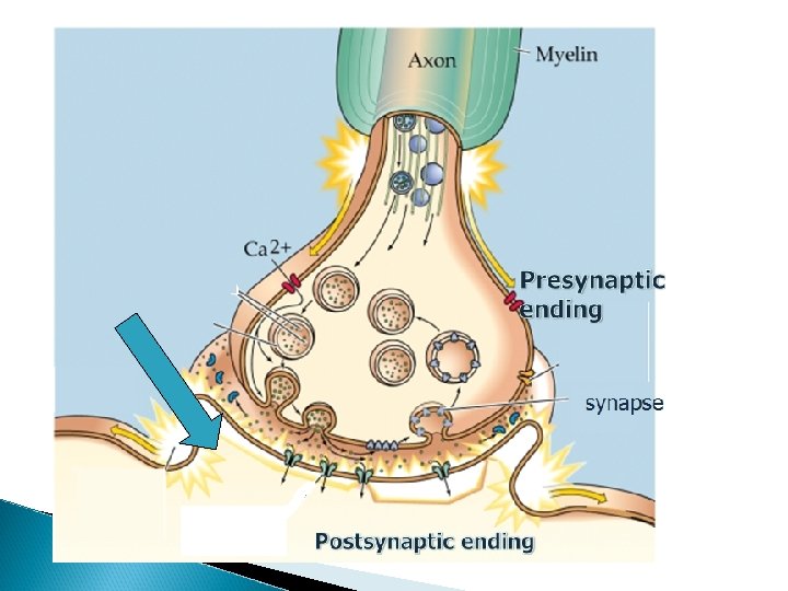 Some terms……. presynaptic ending – ◦ the portion of the axon that is conveying information to the next neuron synapse or synaptic cleft ◦ the space between neurons where communication occurs postsynaptic membrane ◦ the portion of the neuron (usually dendrite) that receives information pre and postsynaptic receptors ◦ proteins in both the presynaptic and postsynaptic ending that allow for information to be transferred