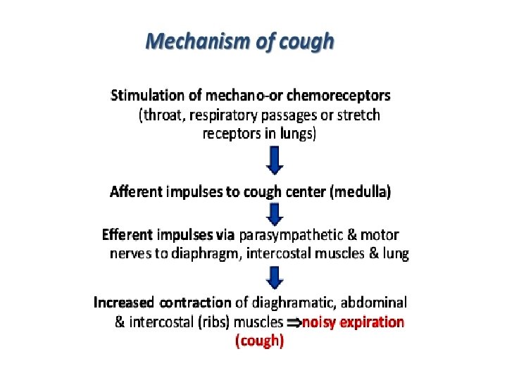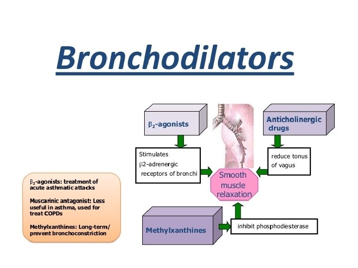 • Antihistamines – H 1 receptor antagonist have little effect on rhinitis associated with colds. – Antihistamines reduce the parasympathetic tone of arterioles and decrease secretion through their anticholinergic activity. – Chlorpheniramine (2 -5 mg), diphenhydramine (15 -20 mg) and promethazine (15 -20 mg) are commonly used as aantitussives. – Second generation antihistamines like terfenadine, loratadine are ineffective. • Bronchodilators – Bronchospasm and can induce or aggravate cough. – Pulmonary receptor stimulation can induce both cough and bronchoconstriction. – Bronchodilators relieve cough and clear secretions by increasing surface velocity of airflow during cough.