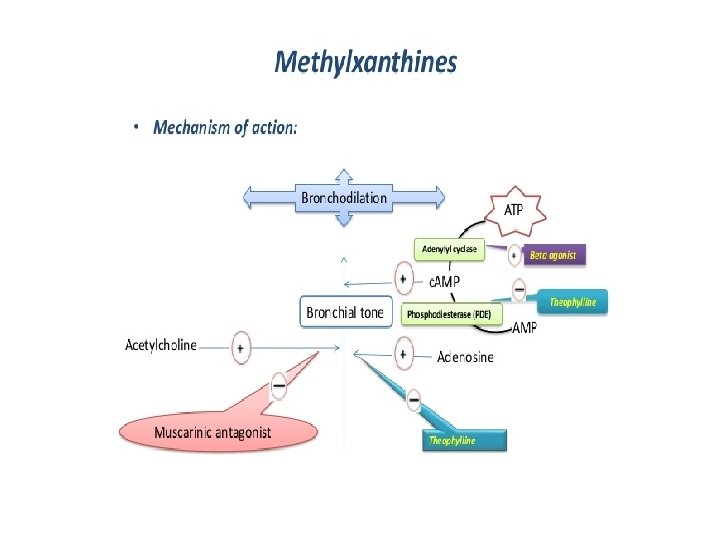 • Methylxanthines – Theophylline and its derivatives are most commonly used for the treatment of COPD and asthma. – Caffeine, theophylline and theobromine are naturally occurring xanthine alkaloids which have qualitatively similar actions. – MOA: • Methylxanthines inhibits cyclic nucleotide phosphodiesterase (PDEs), thereby • • • preventing conversion of c. AMP and c. GMP to 5’-AMP and 5’-GMP, respectively. Inhibition of PDEs will lead to an accumulation of intracellular c. AMP and c. GMP. Bronchodilataion, cardiac stimulation and vasodilatation occur when c. AMP level rises in the concerned cells. Theophylline and related methylxanthines are relatively nonselective in the PDE subtypes inhibitor. Theophylline is a competitive antagonist at adenosine receptors. Adenosine can cause broncho constriction in asthmatics and potentiate immunologically induced mediator release from human lung mast cells. Methylxanthines inhibits the adenosine action thereby casing bronchodilataion.