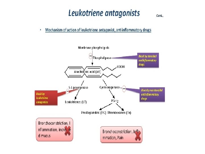 Leukotriene antagonists • Montelukast, Zafirlukast – Both are having similar action and clincial utility – Block the cys-leukotrienes (LTC 4, LTD 4, LTE 4) – Alternative for inhaled glucocorticoids – Prophylactic therapy for mild, moderate asthma; not used for terminating asthma. – Both are very safe drugs and ADRs are few (headache, rashes); eosinophilia and neuropathy are infrequent. Few cases Churg-Strauss syndrome (vasculitis with eosinophilia) have been reported. • Dose: Montelukast 10 mg OD, Zafirlukast 20 mg BD