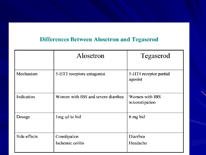 1) 5 -HT 3 receptor antagonists (Alosetron and Cilanestron) are used for diarrhea associated IBS. Dose: 1 mg BID Side Effects: Constipation; Ischemic Colitis 2) 5 -HT 4 partial agonist (Tegaserod): This is used for constipation-predominant IBS in women and also recommended for Rx of chronic constipation. MOA: Stim. Of 5 -HT 4 receptor enhances the release of ACH. The latter increases peristalsis. Dose: 6 mg BID for 8 weeks. Side Effects: Diarrhea; Headache Limitation: does not have significant effect on symptoms of abdominal pain and discomfort.