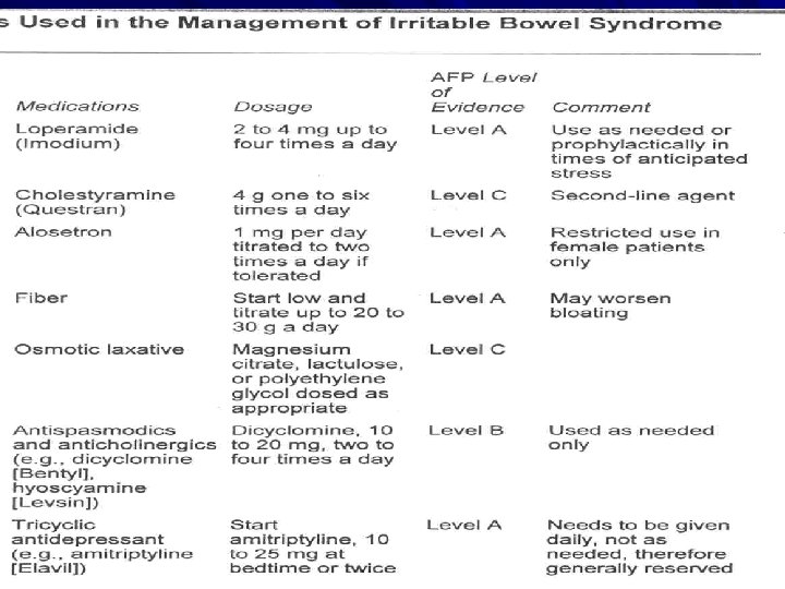 Irritable Bowel Syndrome It is a functional bowel disorder associated by characteristic cluster of symptoms in the absence of detectable structural abnormalities. However, it is a condition of diverse pathophysiology associated with abnormalities in GIT motility (either diarrhea or constipation). Prevalence is around 15% of population. Recent work concentrated to the important role that serotonin plays in such syndrome. Therefore, many of drugs that used for Rx of IBS may act by serotonergic mechanisms (see Table).