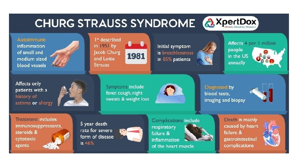 Montelukast & Churg-Strauss syndrome • Eosinophilic granulomatosis with polyangiitis (Churg-Strauss syndrome) • Systemic small vessel vasculitis involving lungs, skin, heart, gastrointestinal tract and peripheral nerves.