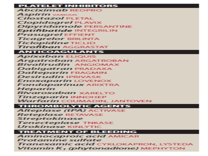 • The drugs used in clotting and bleeding disorders fall into 2 major groups: • (1) drugs used to decrease clotting or dissolve clots already present in patients at risk for vascular occlusion • (2) drugs used to increase clotting in patients with clotting deficiencies.