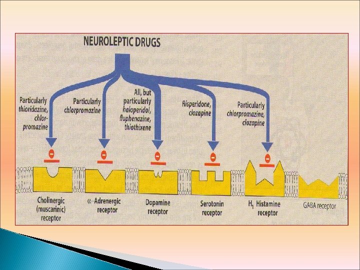 Antipsychotic drugs act on : Dopamine receptors α 1 - adrenoceptors Muscarinic H 1 – histaminic Serotonergic (5 -HT 2)