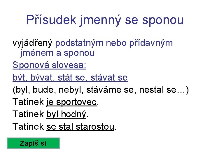 Přísudek jmenný se sponou vyjádřený podstatným nebo přídavným jménem a sponou Sponová slovesa: být, bývat, stát se, stávat se (byl, bude, nebyl, stáváme se, nestal se…) Tatínek je sportovec. Tatínek byl hodný. Tatínek se stal starostou. Zapiš si