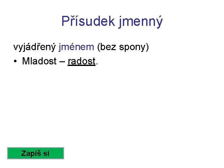 Přísudek jmenný vyjádřený jménem (bez spony) • Mladost – radost. Zapiš si