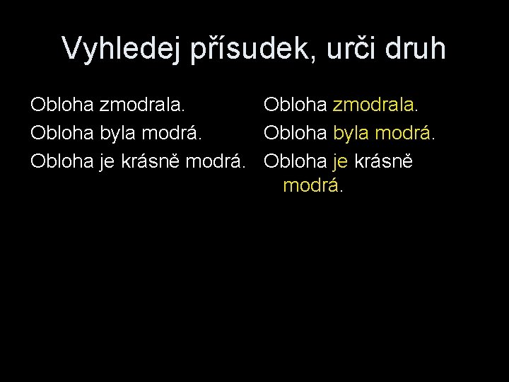 Vyhledej přísudek, urči druh Obloha zmodrala. Obloha byla modrá. Obloha je krásně modrá.