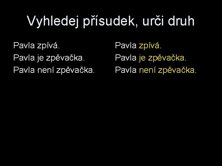 Vyhledej přísudek, urči druh Pavla zpívá. Pavla je zpěvačka. Pavla není zpěvačka.