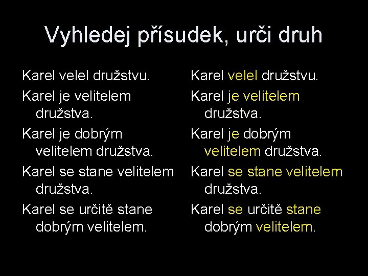 Vyhledej přísudek, urči druh Karel velel družstvu. Karel je velitelem družstva. Karel je dobrým velitelem družstva. Karel se stane velitelem družstva. Karel se určitě stane dobrým velitelem.
