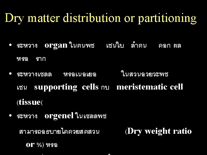 Dry matter distribution or partitioning • Biomass or dry matter Y biol. • Economic yield Y econ. • Dry matter allocation or distribution • Harvest Index Ear Translocation Photosynthate Stem or shooot Root