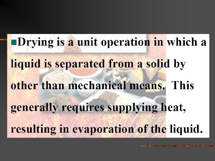 For air temperature of 45 -150 C and mass velocity G of 2450 -29300 kg/h. m 2 or a velocity of 0. 61 -7. 6 m/s and air is flowing parallel to drying surface. Mass velocity (G) = v For air temperature of 45 -150 C and mass velocity G of 3900 -19500 kg/h. m 2 or a velocity of 0. 9 -4. 6 m/s and air is flowing perpendicular to drying surface. To estimate time of drying during constant-rate period: