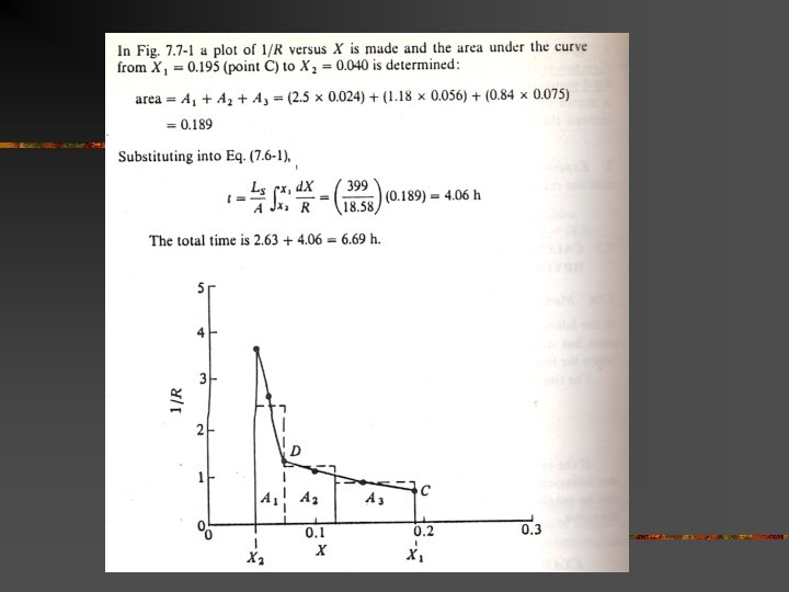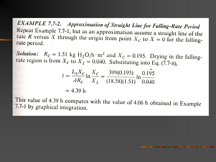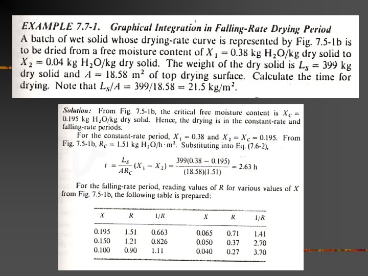 Time of drying from drying curve n n A solid is to be dried from free moisture content X 1 = 0. 38 kg water/ kg dry soild to X 2 = 0. 25 kg water/ kg dry soild. Estimate the time required. Given: Ls/A = 21. 5 kg/m 2 Rc = 1. 51 kg/h. m 2