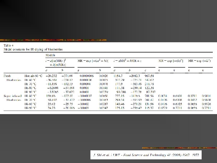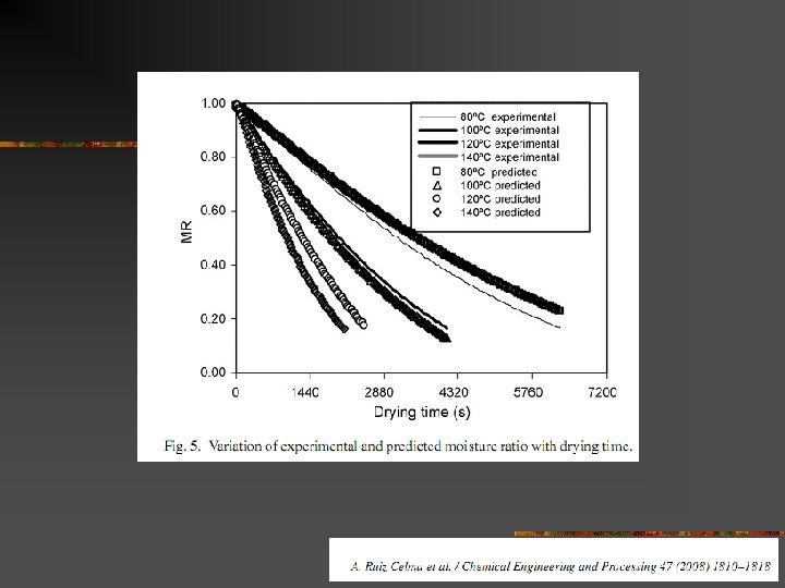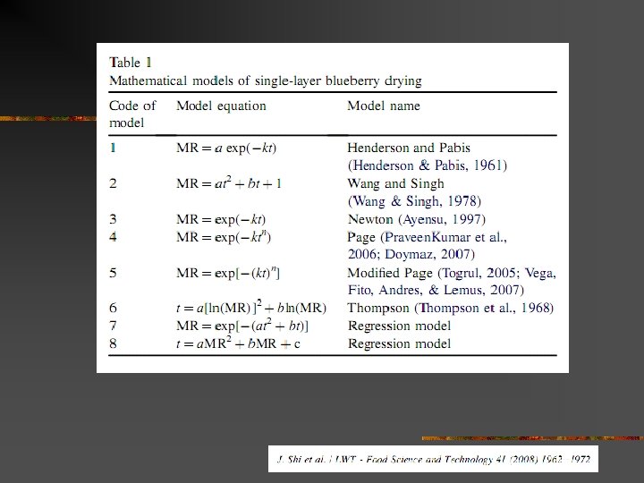 Drying Model: Thin layer drying n n Application: Dryer design, Simulation Three forms of model n Diffusion form n n D = diifusivity constant , D = f(T, RH, etc. ) Log model, modified log model MR = exp(-kt) n k = f(t, RH, IMC) n n MR = exp(-ktn) Quadratic form t = A ln(MR) + B[ln(MR)]2 n A = f(T, RH, IMC), B = f(T, RH, IMC) n