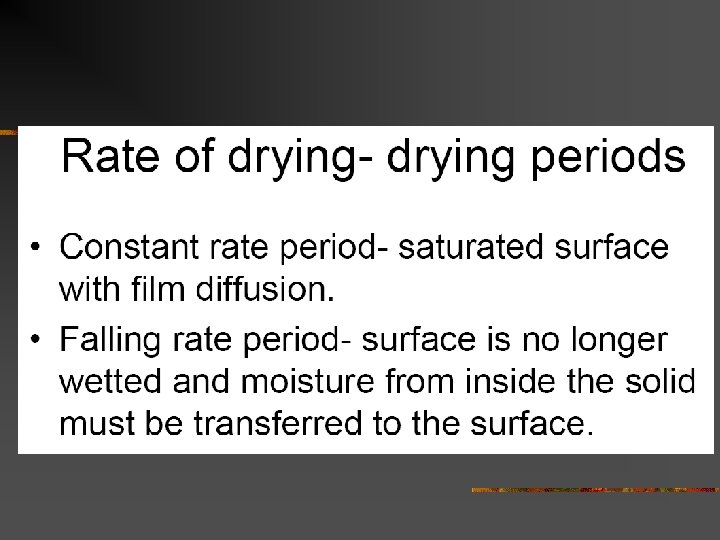 n n At product surface, simultaneous heat and mass transfer occurs but is controlled by convective processes. The transport of vapor from product surface to air and transfer of heat from air to product surface is a function of existing vapor pressure and temperature gradients, respectively.