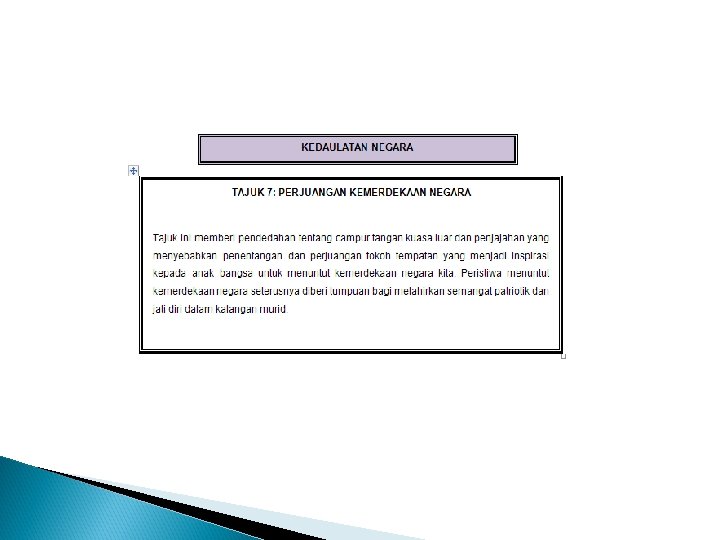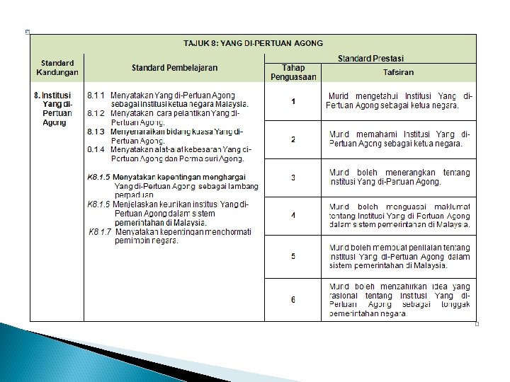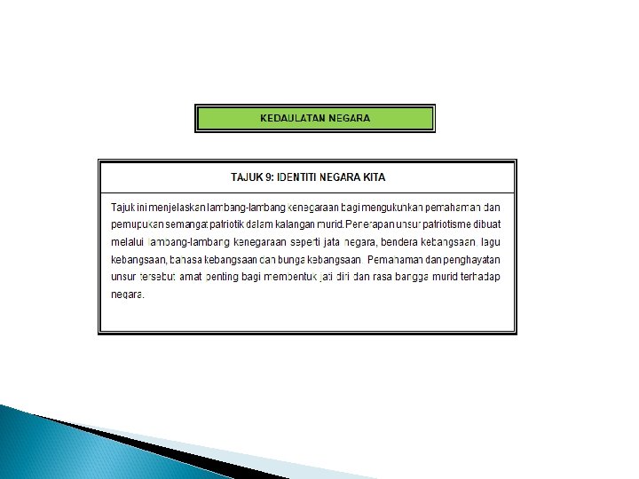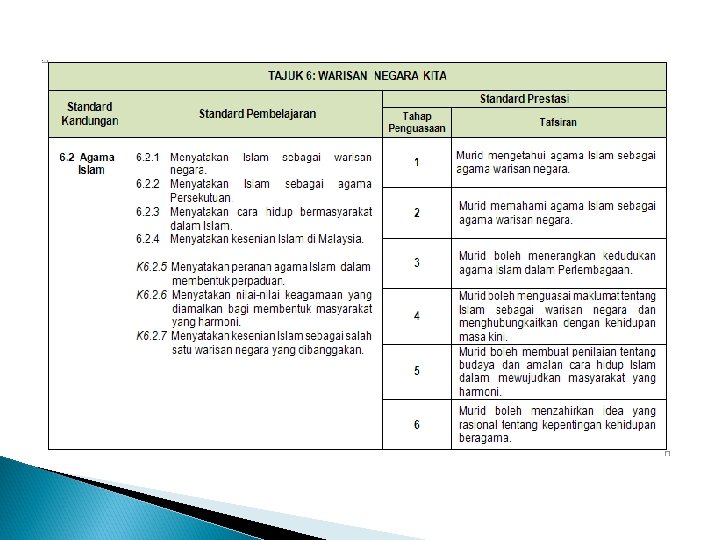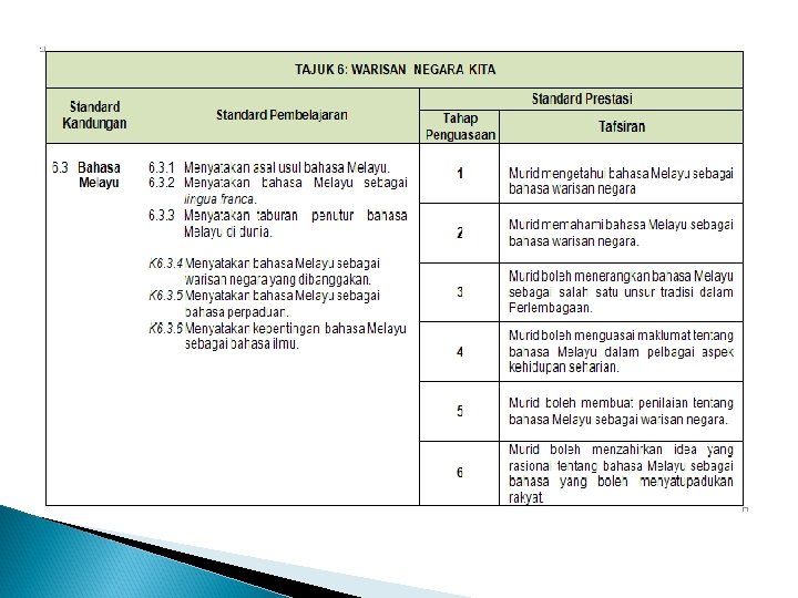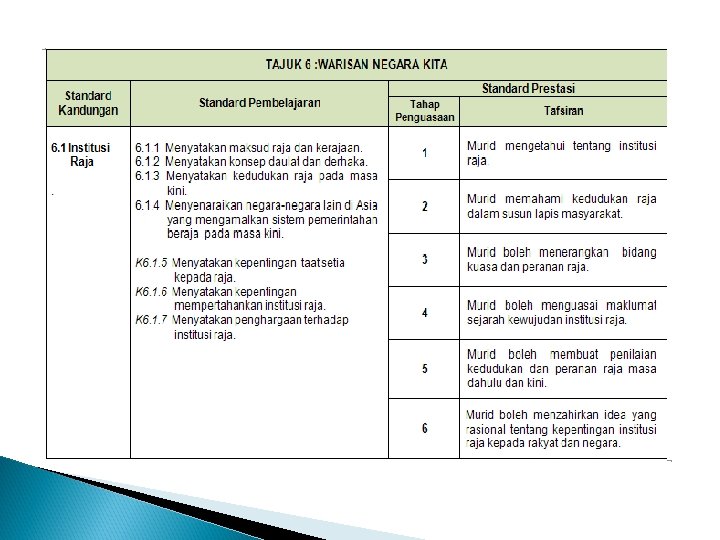 KEDAULATAN NEGARA TAJUK 6: WARISAN NEGARA KITA Tajuk ini memberi pendedahan tentang warisan negara kita kepada murid, yang merangkumi aspek institusi raja, agama Islam dan bahasa Melayu seperti termaktub dalam perlembagaan negara. Pemahaman tentang tajuk ini membolehkan murid menghayati dan menghargai tradisi tersebut sebagai warisan negara bagi melahirkan semangat jati diri dan taat setia kepada negara.