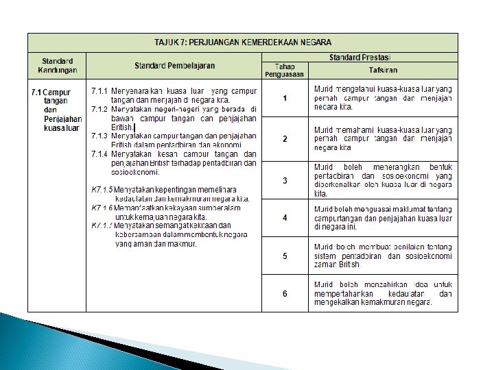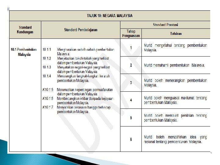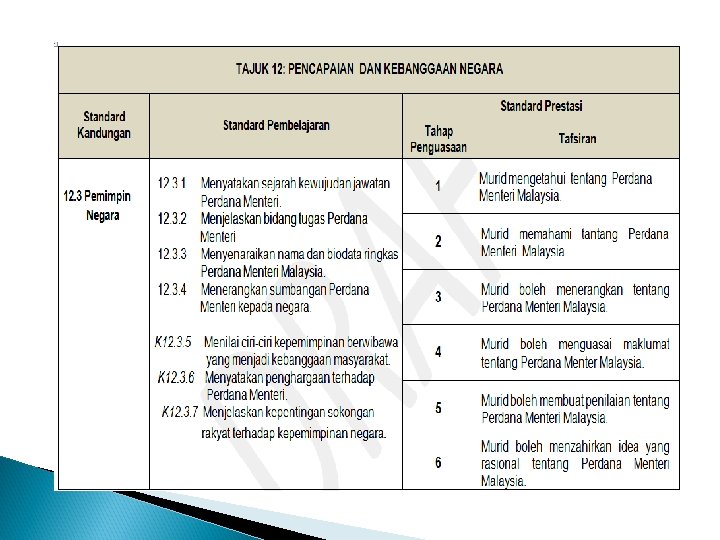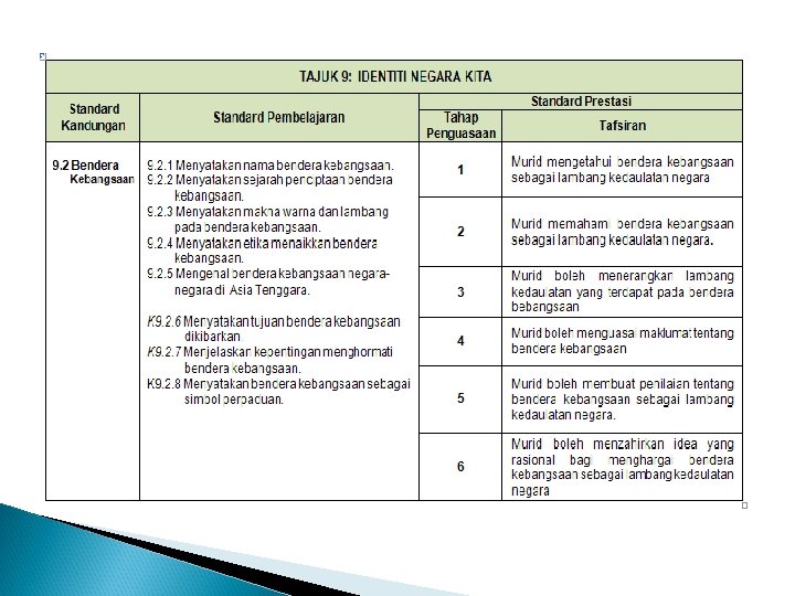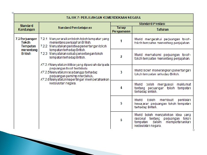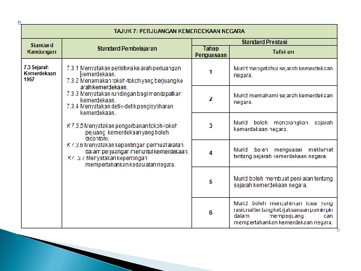 x. memahami cabaran negara dalam konteks mempertahankan kedaulatan negara bagi pembinaan jati diri; xi. mengenal pasti usaha dan sumbangan para pemimpin negara dalam melahirkan perasaan bangga dan hormat; xii. menilai pencapaian dan kemajuan negara dalam bidang politik, ekonomi dan sosial.