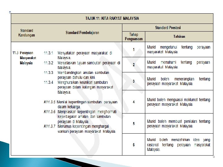 OBJEKTIF Kurikulum Standard Sejarah Sekolah Rendah membolehkan murid: i. memahami peristiwa masa lalu melalui sikap ingin tahu; ii. mengenal pasti pelbagai sumber dan maklumat sejarah; iii. memahami idea, konsep serta elemen sebab dan akibat dalam sejarah; IV. menyatakan kepentingan sejarah dalam kehidupan dengan mengambil iktibar daripada peristiwa sejarah sebagai usaha untuk mengukuhkan suasana keharmonian; v. menyatakan pelbagai bentuk persembahan dan hasil dapatan daripada interpretasi kajian sejarah. vi. menilai warisan negara dalam konteks kawasan setempat, negara dan global; vii. memahami proses pembinaan tamadun manusia yang mempengaruhi kehidupan masyarakat; viii. menjelaskan kehidupan dan kebudayaan masa lalu dan masa kini masyarakat di Malaysia; ix. memahami kedudukan kaum dalam konteks lokasi dan pembentukan kaum sebagai pengukuhan kepada persefahaman kaum;
