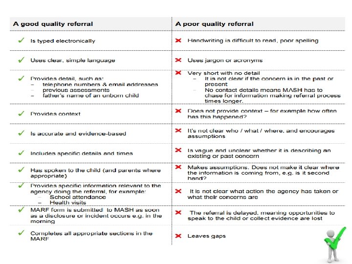 • Completing the MARF • When completing the MARF ensure you complete as much as possible to enable the MASH to make a clear decision and enable any further enquiries that need to be completed. Aspects to consider when completing the MARF: • Ensure you capture the voice of the child – what are their views, wishes and feelings? What do they want to happen next? Remember that this can be obtained by observations of body language, it doesn’t have to be wait a child says. • Be clear in what you write and don’t use generic terms such as ‘inappropriate’, ‘sexualised’, ‘poor home conditions’. Give examples of your concerns and what the impact is on the child. • Chronology – complete a timeline of your intervention and what has previously been attempted? • Have you noticed any changes in the child’s behaviour and/or wellbeing? If so, why do you think this is? • Fact vs Opinion – be clear as to what is factually accurate in your referral. But don’t be afraid to offer your own hypothesis based on your analysis of the concerns. • Submit pieces of evidence such as My Plans, My Assessments, as well as other work you have completed including the Neglect Toolkit, CSE screening tool etc. • How do you know what you know? It is first or third hand evidence? This is important for MASH to know when they are completing their enquiries.