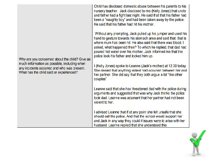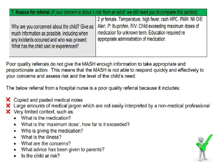 The following example has been completed by a nursery teacher to report a domestic abuse concern. It is a good quality referral because it: • Uses the child’s words and gestures to explain the concern • Makes it clear when the conversation took place • Tells us what advice has been given to the child’s parents • Provides a name that MASH can follow up