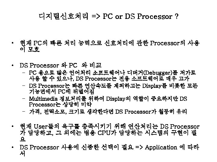 DSP (Digital Signal Processor) Chipset (I) • TMS 320 C 2 X – 16 -bit 고정 소수점방식의 범용 DSP, 효율이 좋아짐, 모터 및 전원 제어 – TMS 320 C 2 XX : TMS 320 C 2 X 시리즈에 특별한 I/O 기능을 추가한 ASDSP (Application Specific DSP) – TMS 320 C 24 X : 전동기의 Motion Control 분야에 적합, 모터와 필터의 최적화 가능, CPU, I/O, 기억장치 등을 한 개의 Chip에 내장 => 부품의 최소화 및 Layout의 최적화 가능 • TMS 320 C 3 X • TMS 320 C 5 X – – – – 1 X 나 2 X 시리즈를 더욱 고성능으로 설계한 모델 20 -, 25 -, 35 -, 50 -ns instruction cycle time Zero-overhead context switching 빠른 bit manipulation을 위한 PLU (Parallel Logic Unit) Up to 32 K words on-chip memory Delayed branch, call and return instructions Software wait-state generation