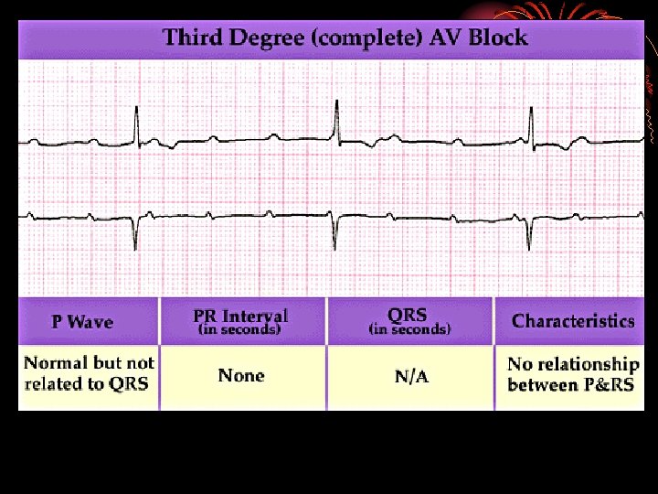 Üçüncü Derece AV Blok • EKG özellikleri; Hız : Atrial hız 60 -100 atım/dk, ventrikül hızı ≤ 40 atım/dk Ritim : Düzenli P dalgası : Sinüs P dalgaları vardır. QRS kompleksleri ile ilişkisi yoktur. P dalgaları QRS kompleksinin içinde görülebilir. P-R aralığı : Değişkendir. QRS : Ventriküller AV noda yakın olarak yerleşmiş ektopik bir pacemaker tarafından aktive oluyorsa normal genişliktedir. ventriküler bir ektopik pacemaker tarafından aktive oluyorsa geniştir.