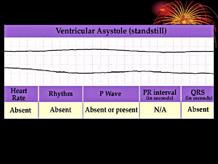 Asistoli • Miyokardiumun elektriksel aktivitesi yoktur. • EKG özellikleri; Dalga defleksiyonları yoktur EKG'de düz bir çizgi görülür. • Tedavi: • ACLS kılavuzu uygulanır • CPR