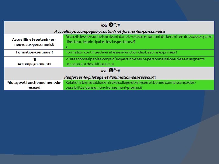 AXE RETENU : Suivi des élèves PLAN D’ACTIONS : Action 1 : Mise en place d’une fiche de suivi pour les élèves rencontrant des difficultés (pédagogiques/comportementales) garantissant une meilleure liaison CM 2 -6 ème Action 2 : Favoriser des stratégies de cycle et aligner les emplois du temps pour avoir des plages horaires communes dans un même domaine (groupe de besoins, co-intervention, décloisonnement, accompagnement personnalisé) Action 3 : Qualifier l’aide personnalisée. Action 4 : Mise en place d’un tutorat entre élèves (se former à la démarche et l’expérimenter) Action 5 : Favoriser au cycle 2 la co-intervention avec les enseignants du RASED (Réseau d’Aide Spécialisés aux Elèves en Difficulté)