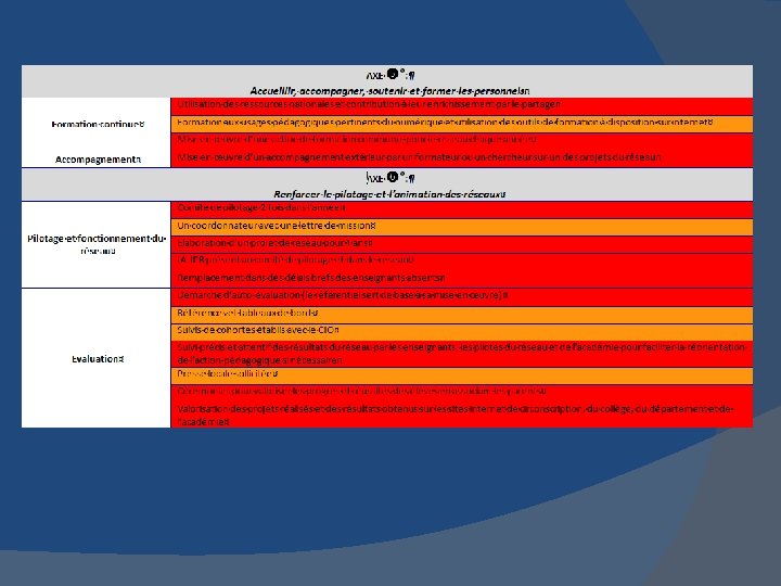 CRITERES D’EVALUATION : Nombre de suivis RASED Nombre de PPRE (Programme Personnalisé de Réussite Educative) dans les écoles et les collèges rencontre directeur/principal pour la passation des fiches de suivi Nombre de cas traités pendant la commission d’harmonisation Nombre d’emplois du temps ayant des plages communes aménagées pour travailler en groupes de besoins FORMATION ET ACCOMPAGNEMENT : PPRE et PPRE passerelle mis à l’ordre du jour d’une réunion de directeurs Formation commune au 1 er et 2 nd degré sur les PPRE et PPRE Passerelle Accompagnement des équipes par les conseillers pédagogiques de la circonscription, selon les besoins