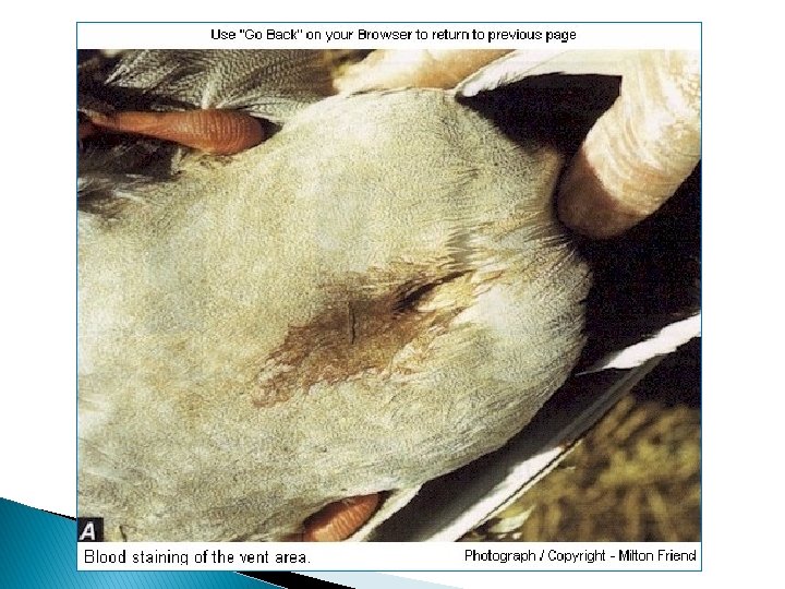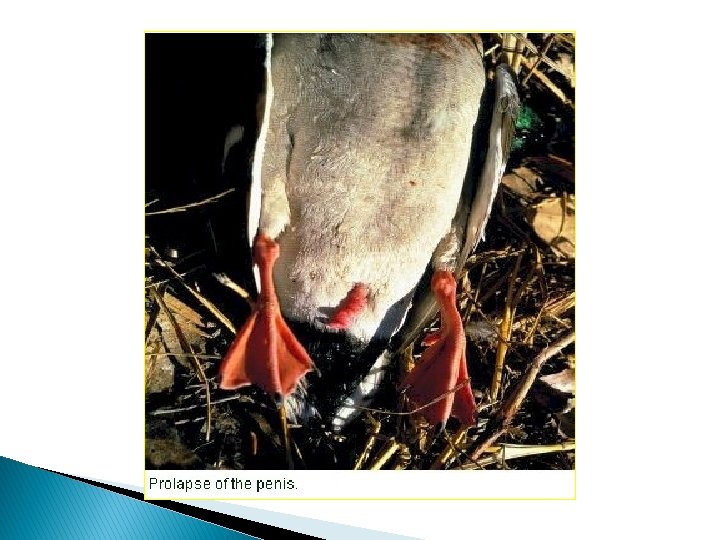 Clinical signs: q The incubation period is 3 -7 days. q Sudden high and persistent mortality, Adult ducks may die in good flesh q Dead males may have prolapse of the penis q Photophobia, Inappetence. q extreme thirst, droopiness, ataxia, nasal discharge. q soiled vents, and watery or bloody diarrhea. q In laying flocks, egg production may drop sharply q Ducklings show dehydration and weight loss, blue beaks and bloodstained vents