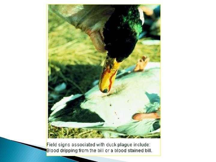 Transmission � The disease can be transmitted by direct or indirect contact between the infected duck to healthy susceptible one. � Ingestion of contaminated water with the virus. � Recovered birds may remain carriers and act as source of infection for susceptible ducks.
