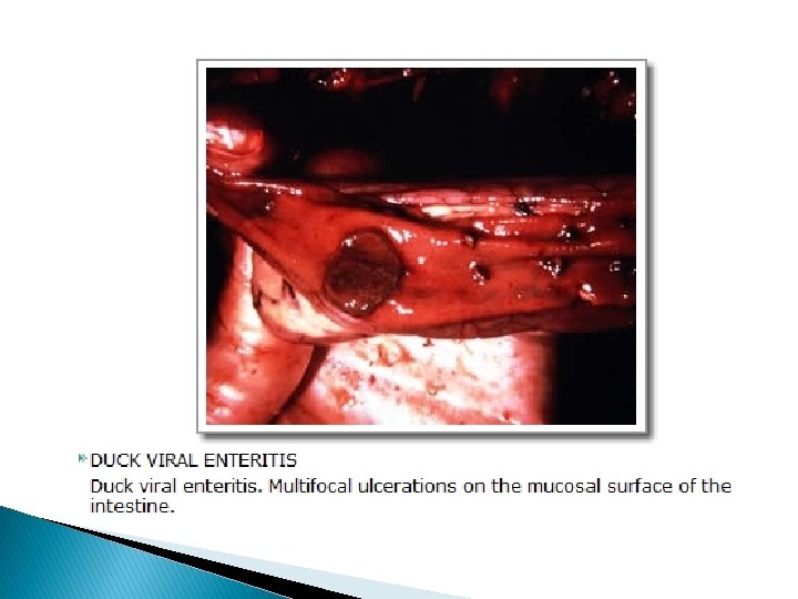 Etiology: � Herpesvirus. � causes intranuclear inclusion bodies in infected tissues and in inoculated cell cultures. � The virus is relatively sensitive to heat and p. H; lipid solvents, trypsin. � Propagated on CAM of 9 - to 14 -day-old embryonated Muscovy duck eggs may result in isolation of the virus. � I/M inoculation of day-old ducklings and observe the pathogenicity of the disease. (more sensitive than egg inoculation). � � Propagated on cell cultures producing cytophatic effect