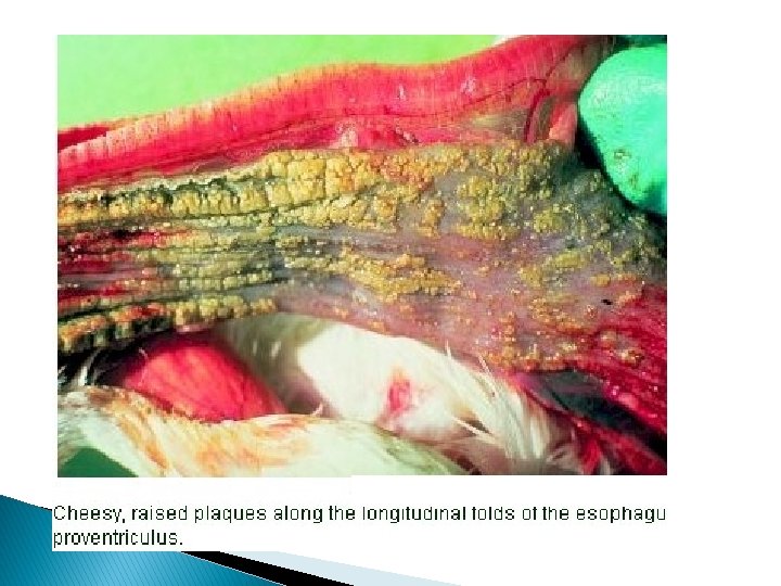 Post Mortem Lesions: � Petechial and ecchymotic hemorrhages on the heart (paint brush appearance), liver, pancreas, mesentery, and other organs are characteristic � Hemorrhages in various tissues and free blood in body cavities indicate severe damage to blood vessels throughout the body � Specific mucosal eruptions, found in the oral cavity, esophagus, ceca, rectum, and cloaca.