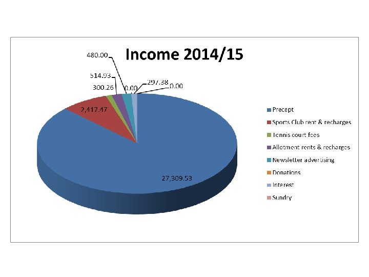 Income in £ Year ended 31 March 2015 Year ended 31 March 2014 27, 309. 53 2, 417. 47 300. 26 514. 93 480. 00 297. 38 0. 00 26, 500. 00 2, 371. 97 169. 81 544. 52 412. 50 40. 00 488. 37 178. 66 £ 31, 319. 57 £ 30, 705. 83 RECEIPTS Precept Sports Club rent & recharges Tennis court fees Allotment rents & recharges Newsletter advertising & donations Donations Interest Sundry TOTAL INCOME