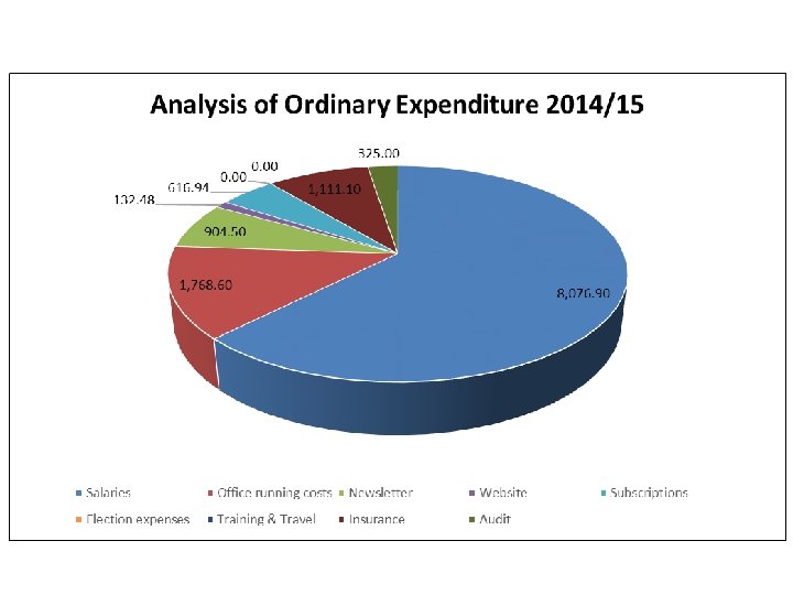 Ordinary Expenditure in £ Salaries Office running costs Newsletter Website Subscriptions Training & Travel Insurance Audit TOTAL ORDINARY EXPENDITURE 8, 076. 90 1, 768. 60 904. 50 132. 48 616. 94 0. 00 1, 111. 10 325. 00 5, 661. 72 1, 405. 21 826. 61 28. 00 75. 00 320. 00 1, 135. 51 320. 00 £ 12, 935. 52 £ 9, 772. 05