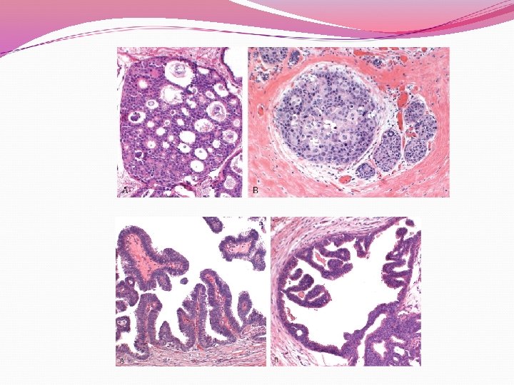 Histology 5 architectural subtypes: comedocarcinoma, solid, cribiform, papillary and micropapillary Majority show a mixture of patterns Malignant polyclonal population of cells limited to ducts and lobules by the basement membrane