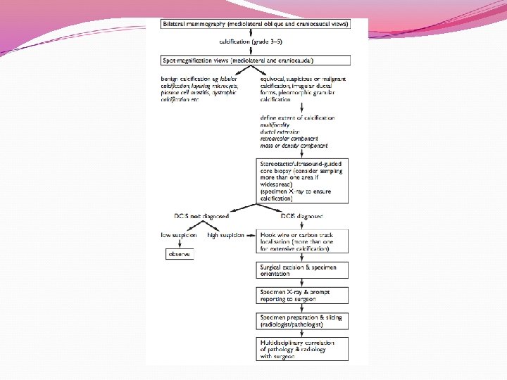 Diagnosis Most commonly detected as mammographic caclification BI-RADS Classification 0. Incomplete 1. Negative 2. Benign 3. Probably benign 4. Suspicious 5. Highly suggestive of malignancy 6. Known biopsy-proven malignant