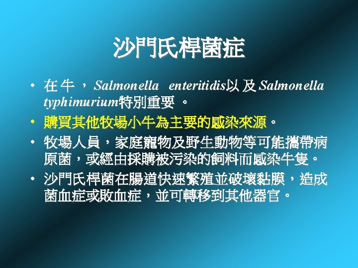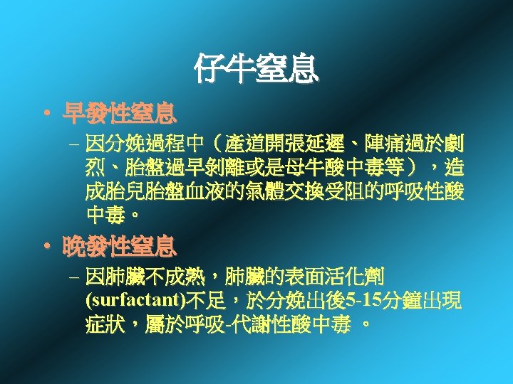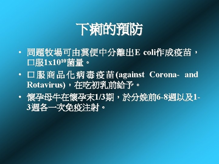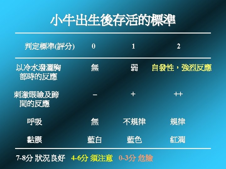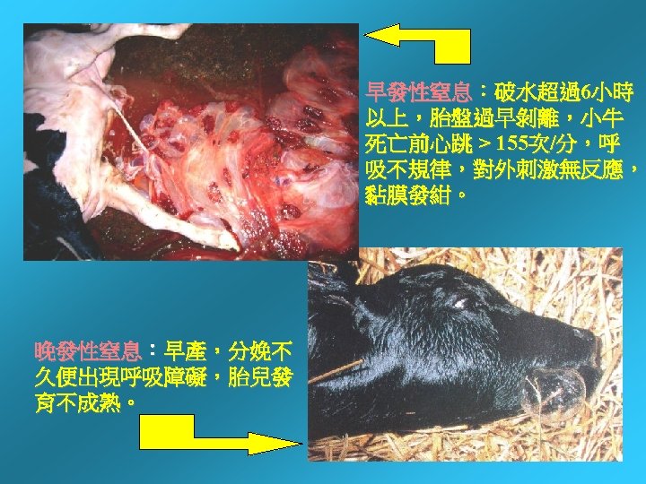 新生仔牛死亡率與出生日齡的關係 出生日齡 0 -10 11 -20 21 -30 31 -40 41 -50 51 -60 死亡率(%) 7. 71 0. 72 0. 19 0. 14 0. 08 0. 03 總計(%) 8. 62 0. 25 *In dairy cattle, 75% of perinatal mortality occurs within on hour of birth. In beef cattle, 69% of calf deaths between birth and weaning occur within 96 hours of birth.