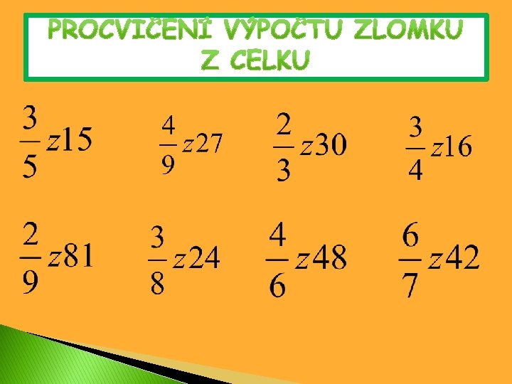 Jak vypočítáme určenou část z daného celku? (10 : 2) × 1 = 5 z 10 = 5 Celek musíme vydělit počtem dílků, na které je celkově rozdělen, a potom vynásobit počtem dílků, které jsme z celku vyjmuli.