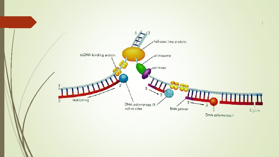 DNA primase A Primase se liga ao DNA e sintetiza um primer de RNA, com aproximada/ 11 bases; fornece 3’ OH Molde de DNA Quando o primer está completo, a DNA polimerase III se liga e sintetiza o novo DNA polimerase III Primer de RNA Primase é liberada Primer de RNA Novo DNA