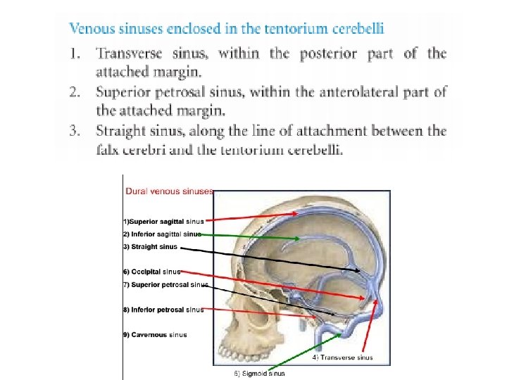 Venous sinuses enclosed in the falx cerebri 1. Superior sagittal sinus is enclosed within convex upper border. 2. Inferior sagittal sinus is enclosed within lower concave margin. 3. Straight sinus lies along line of attachment of falx cerebri with tentorium cerebelli