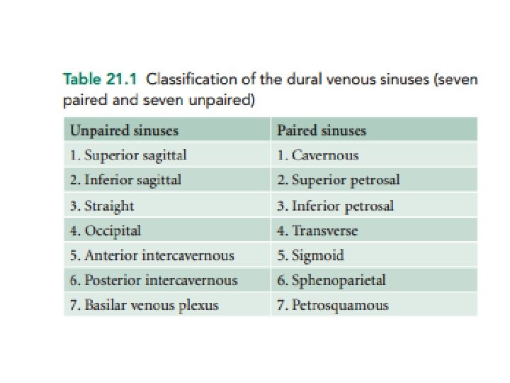 Cranial venous sinuses • The dural venous sinuses (also called dural sinuses, cerebral sinuses, or cranial sinuses) are venous channels found between layers of dura mater in brain. • They receive blood from internal and external veins of brain, receive cerebrospinal fluid (CSF) from the subarachnoid space, and ultimately empty into internal jugular vein.
