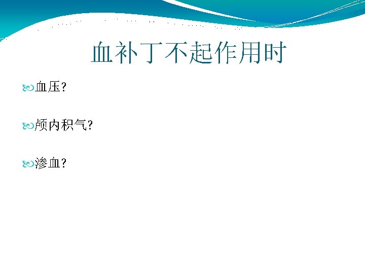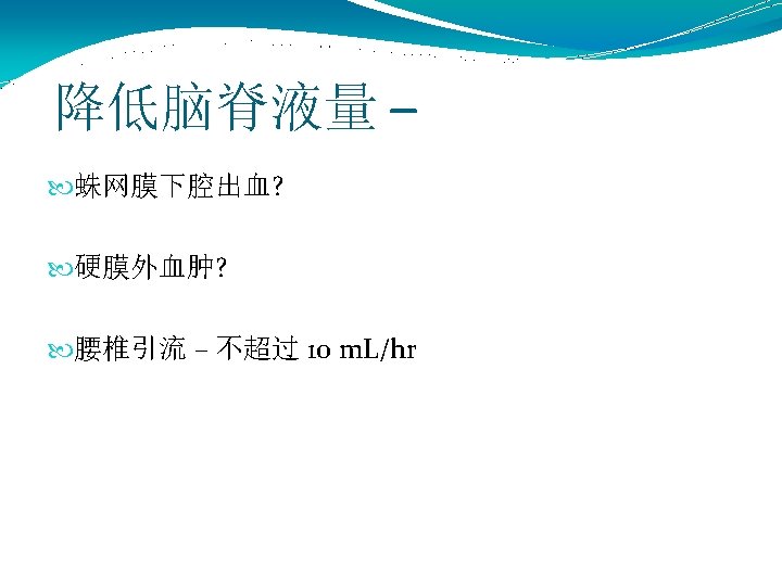 机制 CSF渗漏 直立时颅内结构有一个向下的牵引力 CSF容量下降 通过血管舒张,使脑部血流量代偿性增加 Monro-Kellie doctrine Alexander Monro, Scottish anatomist and surgeon, 1733 -1817; George Kellie, Scottish anatomist, late 18 th century: An increase in volume of one component in the CNS will elevate pressure and decrease the volume of one of the other elements. Mosby's Medical Dictionary, 2009