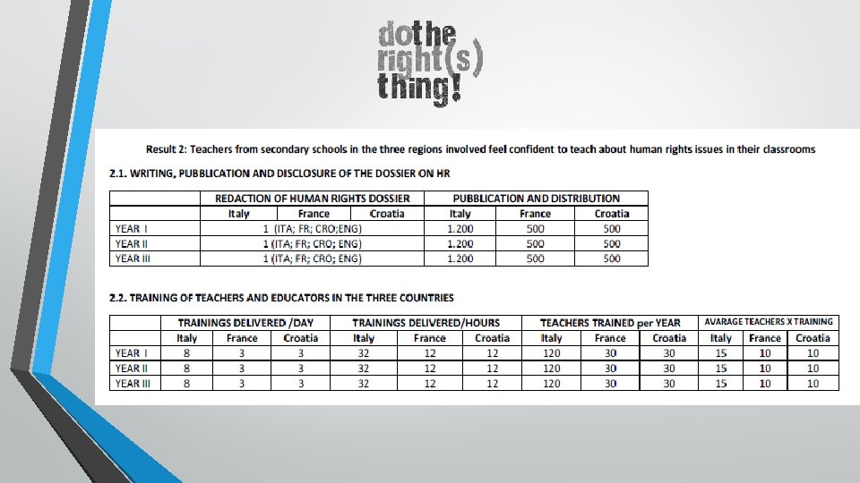 ATTIVITÀ PREVISTE PER IL RAGGIUNGIMENTO DEL RISULTATO 2: 2. 1. Redazione e pubblicazione di un Dossier dei Diritti Umani 2. 2. Formazione dei formatori e degli insegnani nei tre paesi coinvolti (legato all’attività 1. 2. )