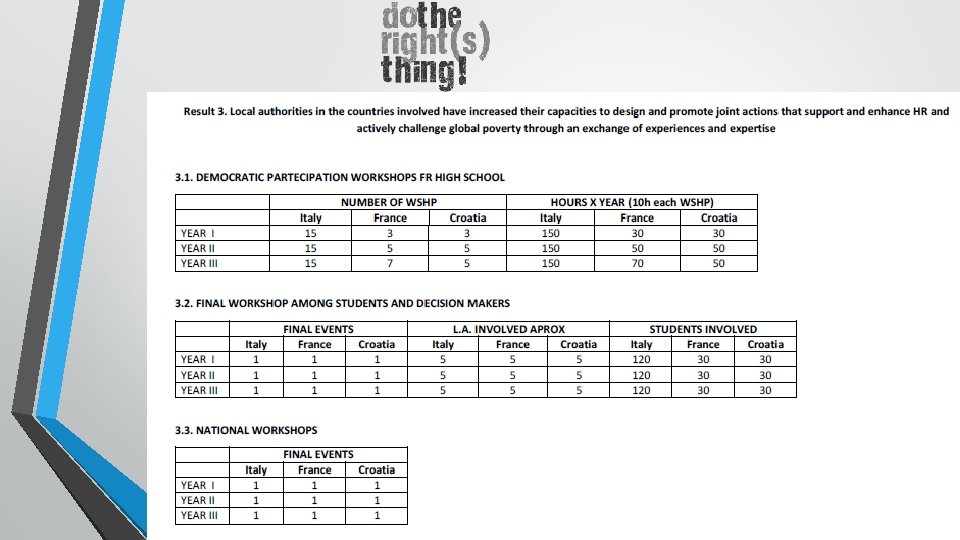 ATTIVITÀ PREVISTE PER IL RAGGIUNGIMENTO DEL RISULTATO 3: 3. 1. Laboratori di partecipazione democratica per le scuole medie superiori; 3. 2. Laboratori tra studenti e decisori politici 3. 3. National work-shop e trainings