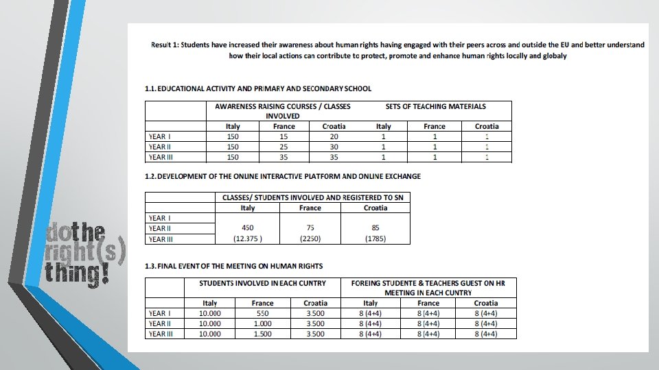ATTIVITÀ PREVISTE PER IL RAGGIUNGIMENTO DEL RISULTATO 1: 1. 1. Attività educative nelle scuole medie inferiori e nelle scuole medie superiori 1. 2. Creazione di una piattaforma interattiva on-line e lo scambio on-line 1. 3. Il Meeting dei Diritti Umani