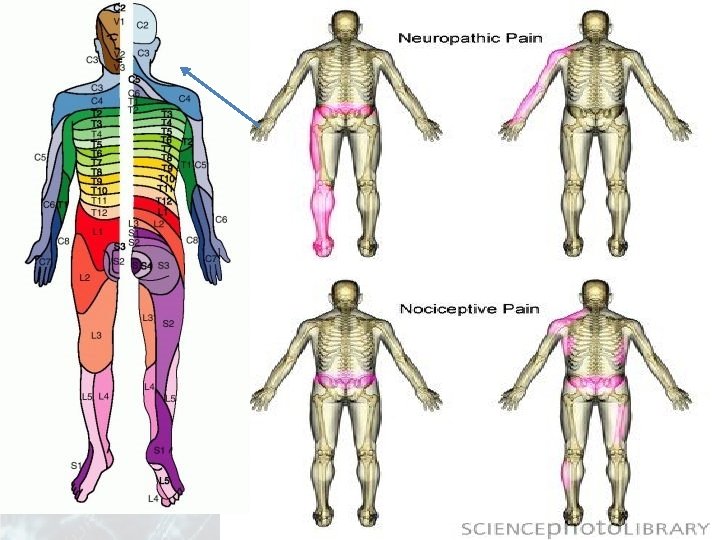 2. Durerea NEUROPATA • Neuroplasticitate maladaptiva durere spontana si/sau exagerata fara functie utila • Leziune SN schimbari permanente in conexiuni • Durerea = patologia in sine boala de sine statatoare • Caracter arsura, junghi, fulgeratoare, de mare intensitate • Localizare ~difuza, ~respecta distributia anatomica a nervilor (dermatoamele)