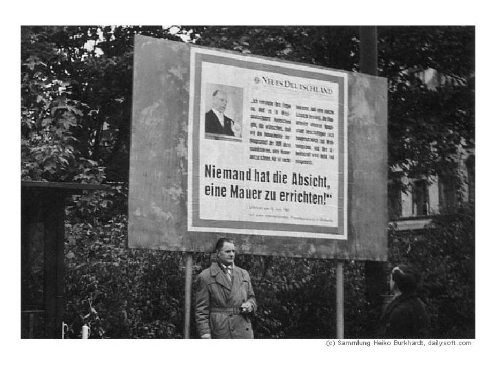 Two months before the wall was build Walter Ulbricht, the East German leader, declared at an international press conference on June 15, 1961: "I understand your question rightly that there are people in West Germany who wish that we mobilize the building worker of the capital of the German Democratic Republic to build up a wall. Not that I am aware of a such intention exists. The building workers of our capital are mainly busy with house building and their manpower is fully used for that. "