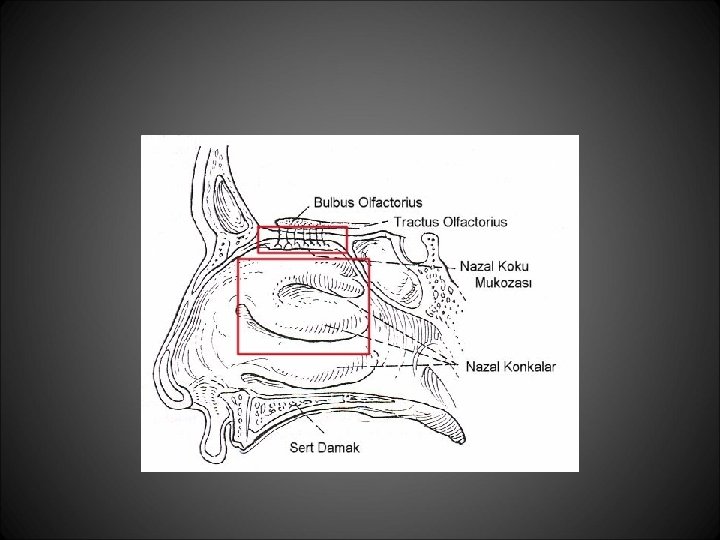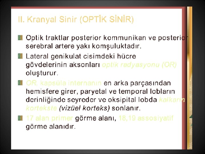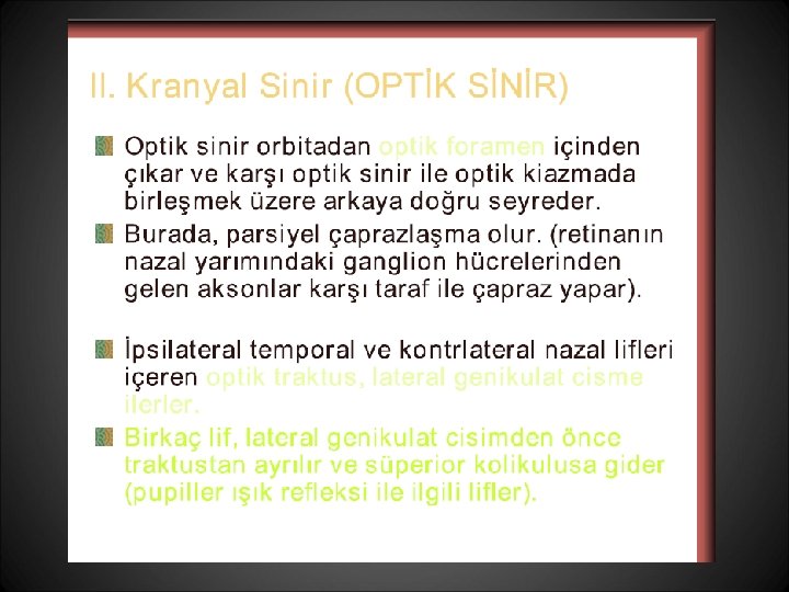 N. olfactorius disfonksiyonu belirtileri: §Negatif: Hiposmi, Anosmi §Pozitif: Hiperosmi, Kakozmi Hasar yerleşimi Etyolojik neden Duysal reseptörler ve primer nöron Travma, Üst solunum yolu infeksiyonu, Burun veya sinüs hastalığı , Toksinler Sekonder nöronlar: §B. Olfactorius, T. olfactorius Meningiom , frontal tm, hipofiz adenom, anevrizma Olfaktor korteks Epilepsi, tm, infarkt, alzheimer hastalığı