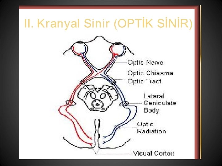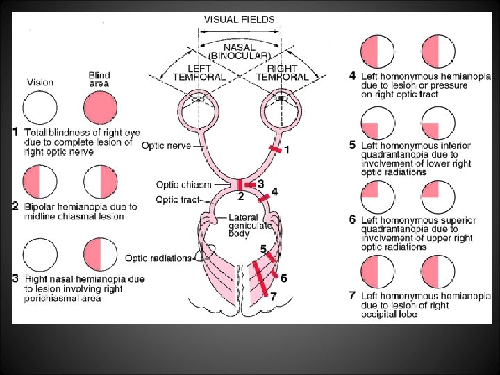 Optik kiazma §Tümör: Kiazmal-hipotalamik gliomlar, kraniyofaringeomalar, hipofiz adenomları, meningeomalar §Vasküler: Hipofiz apopleksisi, int. karotid arter anevrizması §Hidrosefali Tractus opticus ve c. geniculatum laterale §Tümör §Demiyelizan hastalıklar Radiatio optici §Vasküler §Tümör §Demiyelizan hastalıklar Oksipital lob §Vasküler §Primer veya metastatik tümörler